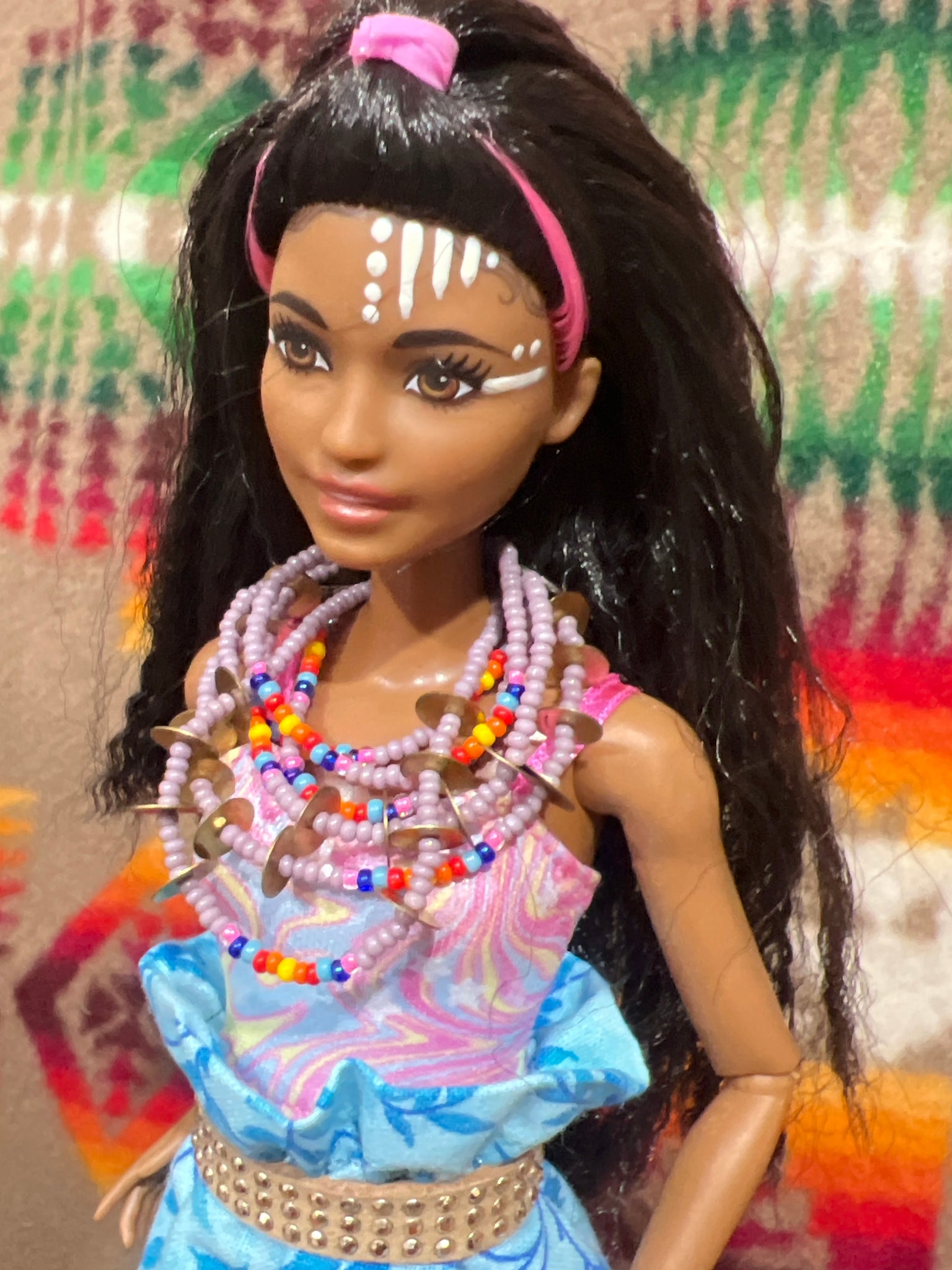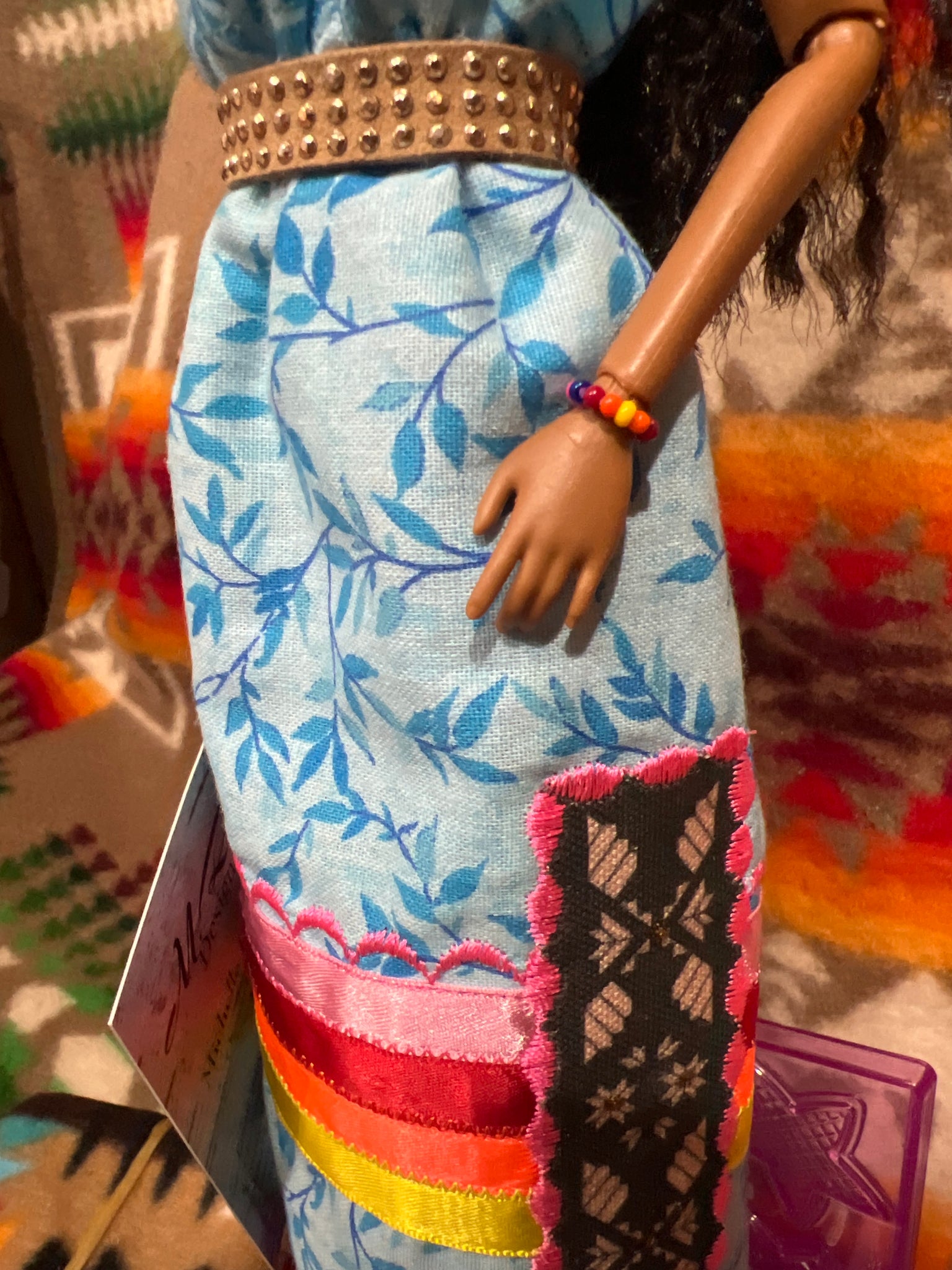 Doll with detailed ribbon skirt, doll stand, glass seed bead and brass disc multi layer necklace, belt, blanket, and hand painted daily wear shoes.
