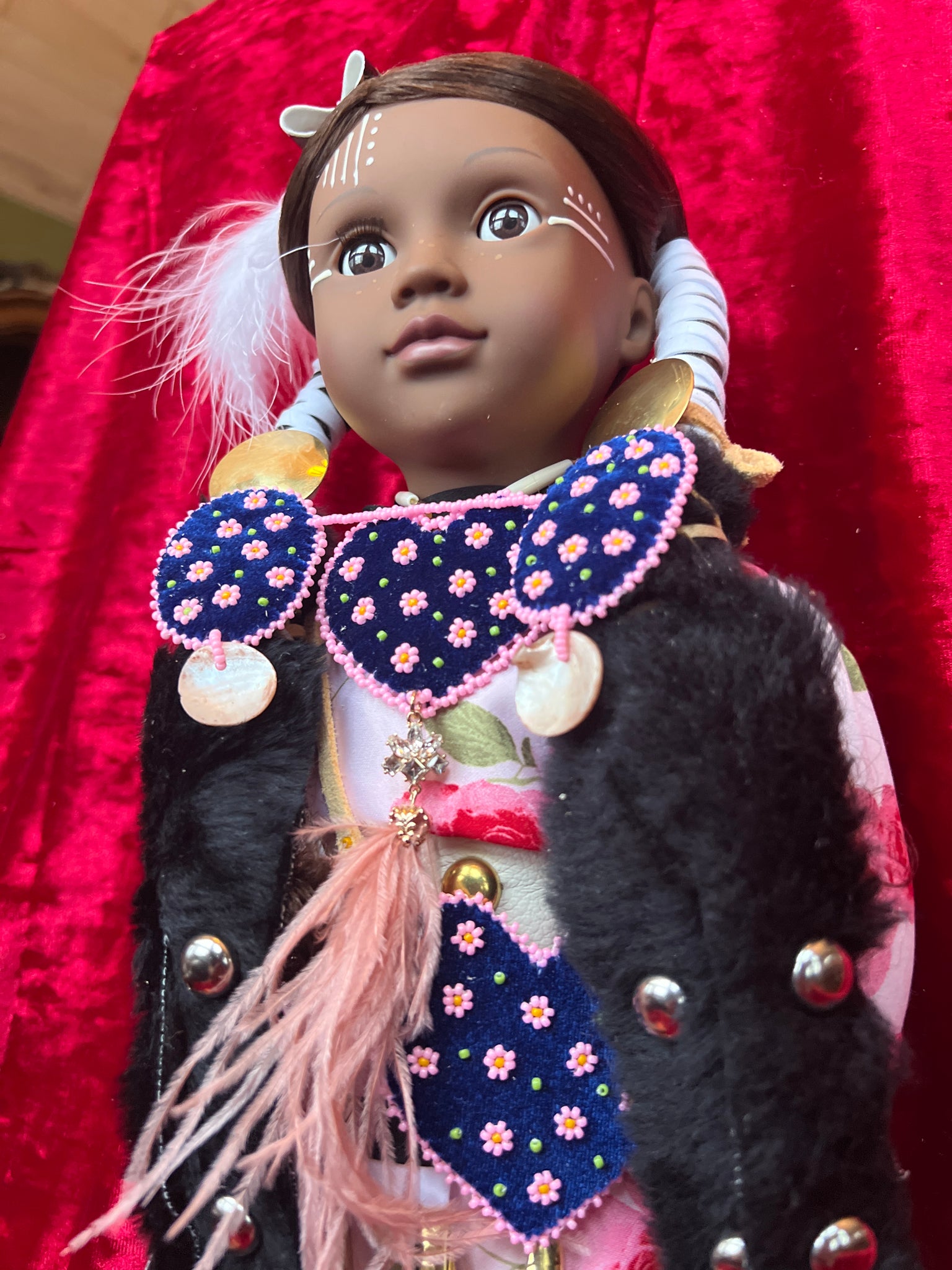 18 inch doll wearing jingle Dress, leather hand made moccasins with bead details, studded leather belt, leather yoke, beaded velvet floral hair ties and, faux fur wraps and detailed velvet bandolier cross body purse. Also bracelet, tiny bow with plume and a fleece blankie