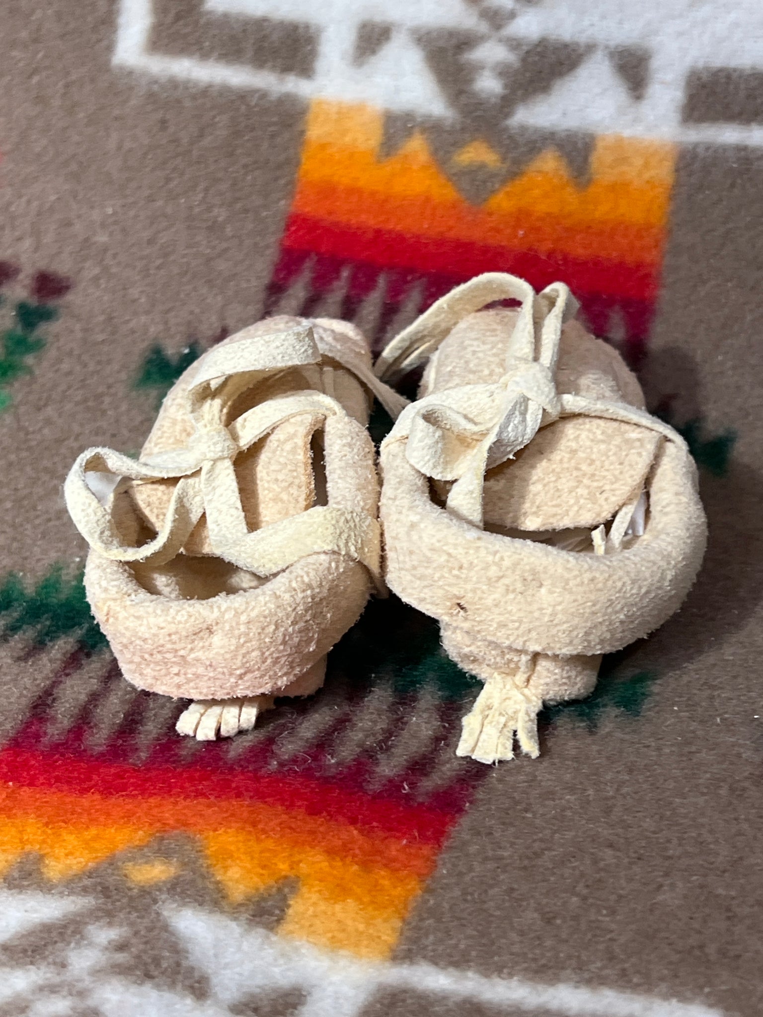 These Ojibwe pucker toe moccasins are made with top quality German Tanned deer hide. The moccasins measure 3 1/4 inches long. Hand made, newborn size with tiny holes in them done in our traditional way, to maintain the child’s connection to the earth.